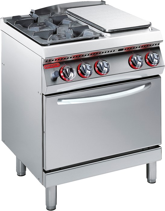 כיריים גז 2 מבערים, פלטה מוצקה גז בצד ימין, תנור סטטי גז GN2/1, בנוי נירוסטה 18-10, 12/10 עובי, רשת עליונה ומבערים נשלפים