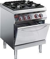 כיריים 4 מבערים, תנור סטטי גז GN2/1, בנוי נירוסטה 18-10, 12/10 עובי, רשת עליונה ומבערים נשלפים, עשויים ברזל יצוק מצופה אימייל ותנור גז עם תרמוסטט