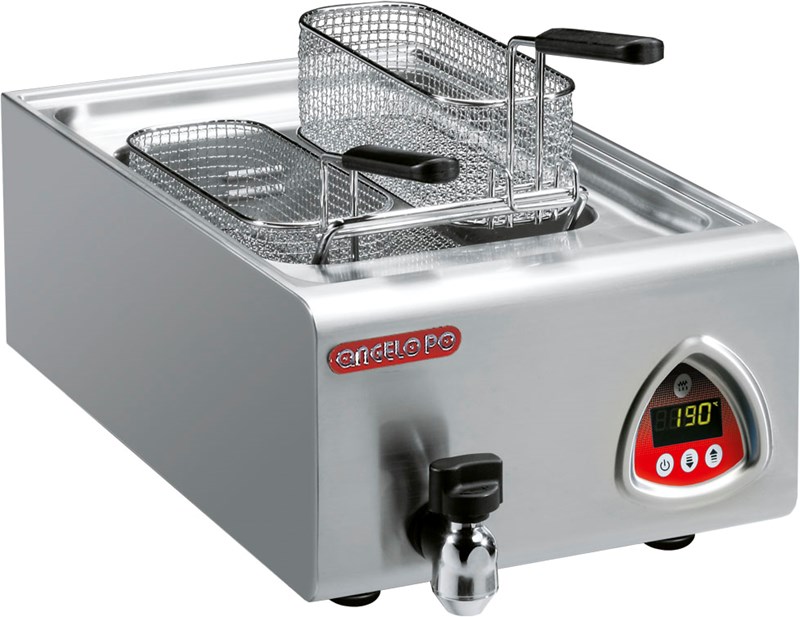 מטגנת (צ'יפסר) שולחנית תא אחד 5 ליטר, 6 ק"ג צ'יפס / שעה, בנוי נירוסטה 18-10, 10/10 עובי, בקרת טמפ' דיגיטלי עם תרמוסטט 0-195°C ותרמוסטט בטיחות ואזור ניקוז