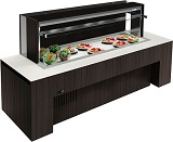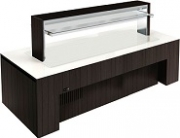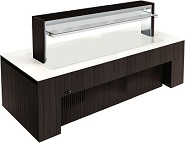 מתאים ל-6 גסטרונומים 1/1 , פס הגשה חם XL חלק תחתון עשוי עץ משטח שיש בשילוב קוורץ באיכות גבוהה מסגרת זכוכית מחוסמת פתחי צד לאחסון צלחות זכוכית קריסטל עליונה מחוסמת עם מנורות הלוגן מערכת הורדה והרמה של One-touch הזכוכית טמפ' עם בקרה דיגיטלית יחידת מרקייה בהתאם למפרט מעלה – כלול במחיר הפס